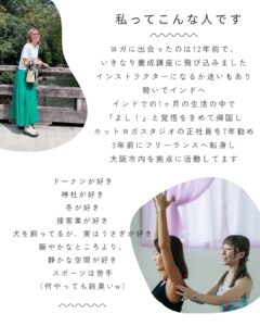 ヨガに出会った12年前。勢いでインドの養成講座に飛び込み、一か月の滞在中に「ヨガを伝えたい」という思いが芽生えました。帰国後はホットヨガスタジオの正社員として7年勤務。3年前からフリーのインストラクターとして活動し、現在は大阪市内を拠点にレッスンを行っています。